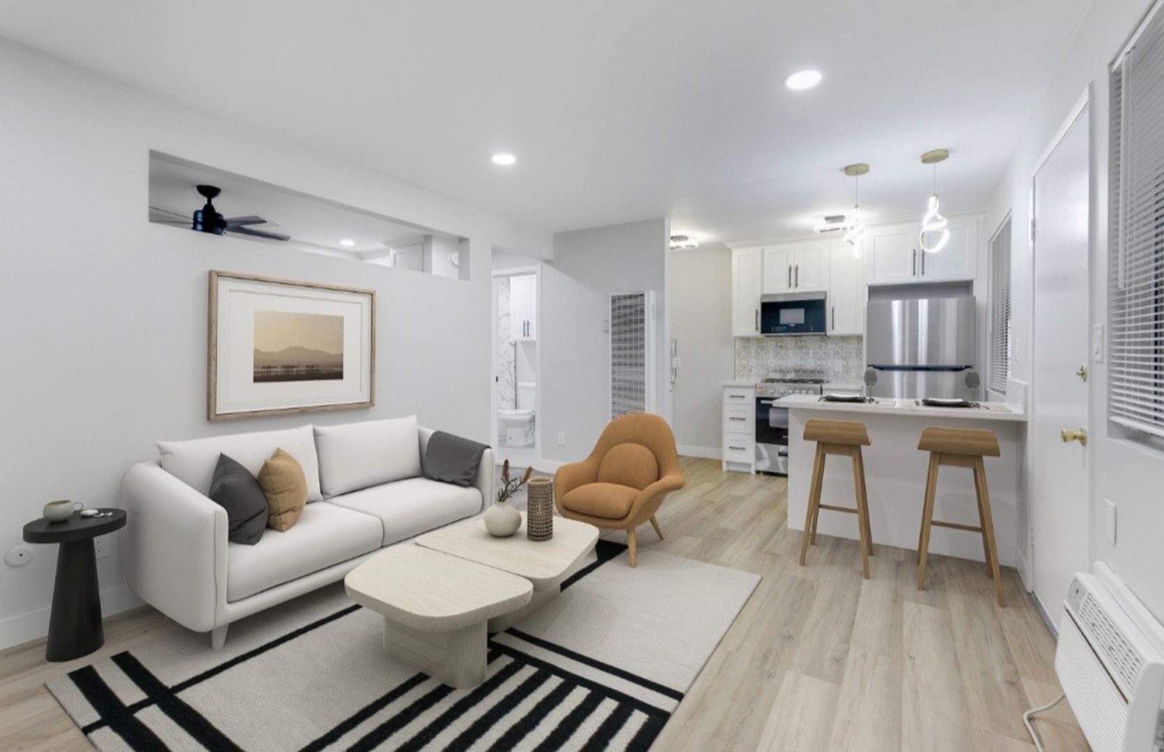 Enjoy the recently remodeled units, one bedroom Jr, boasting new flooring, upgraded kitchens, new cabinets and countertops, with all new stainless-steel appliances, new modern bathrooms and ceiling fan. Freshly painted and ready for move -in! Our renovated modern apartment includes parking, water, and trash services. Tenant is responsible for electricity.