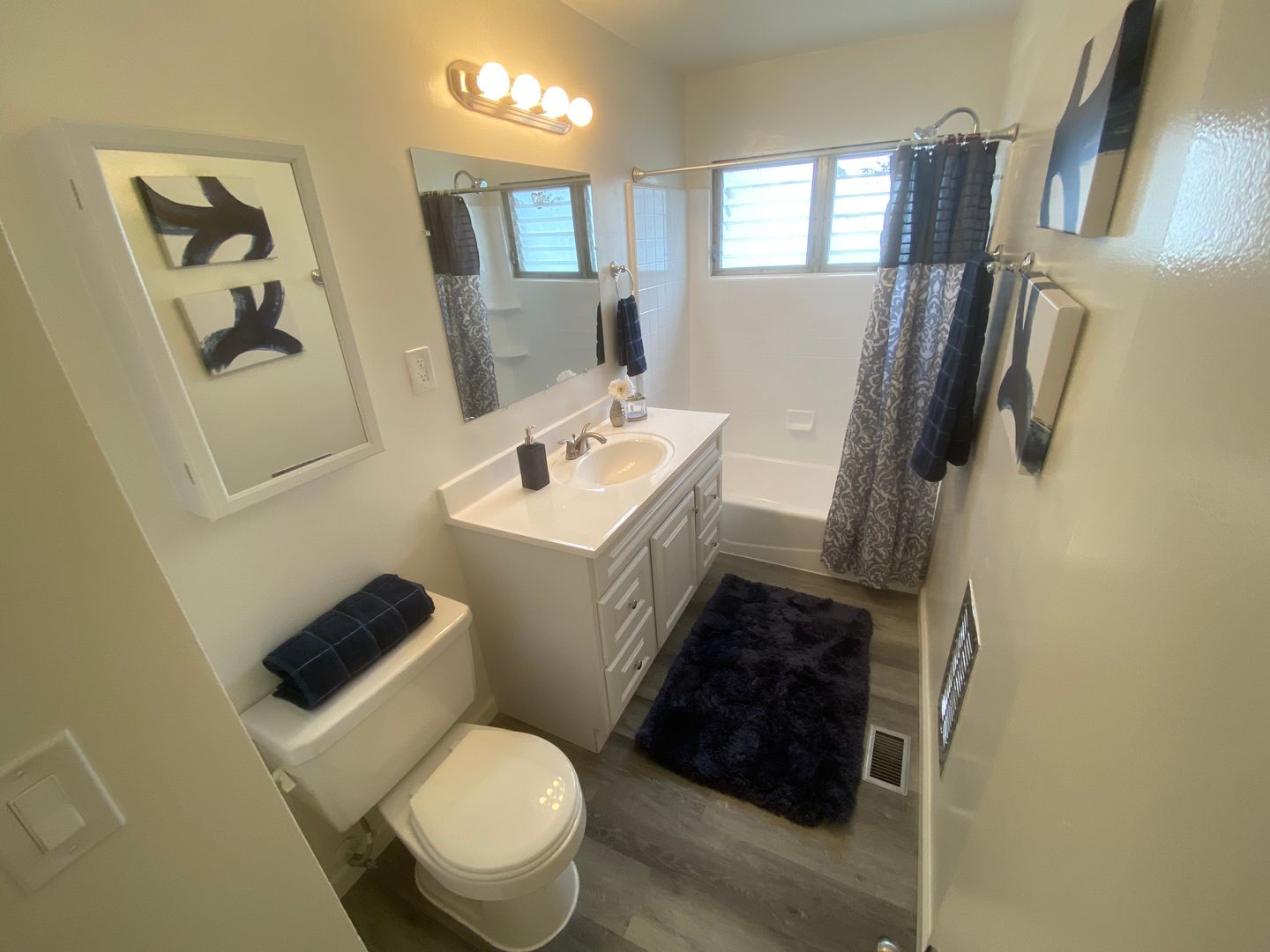 Recessed lighting throughout the apartment creates a bright and inviting atmosphere.