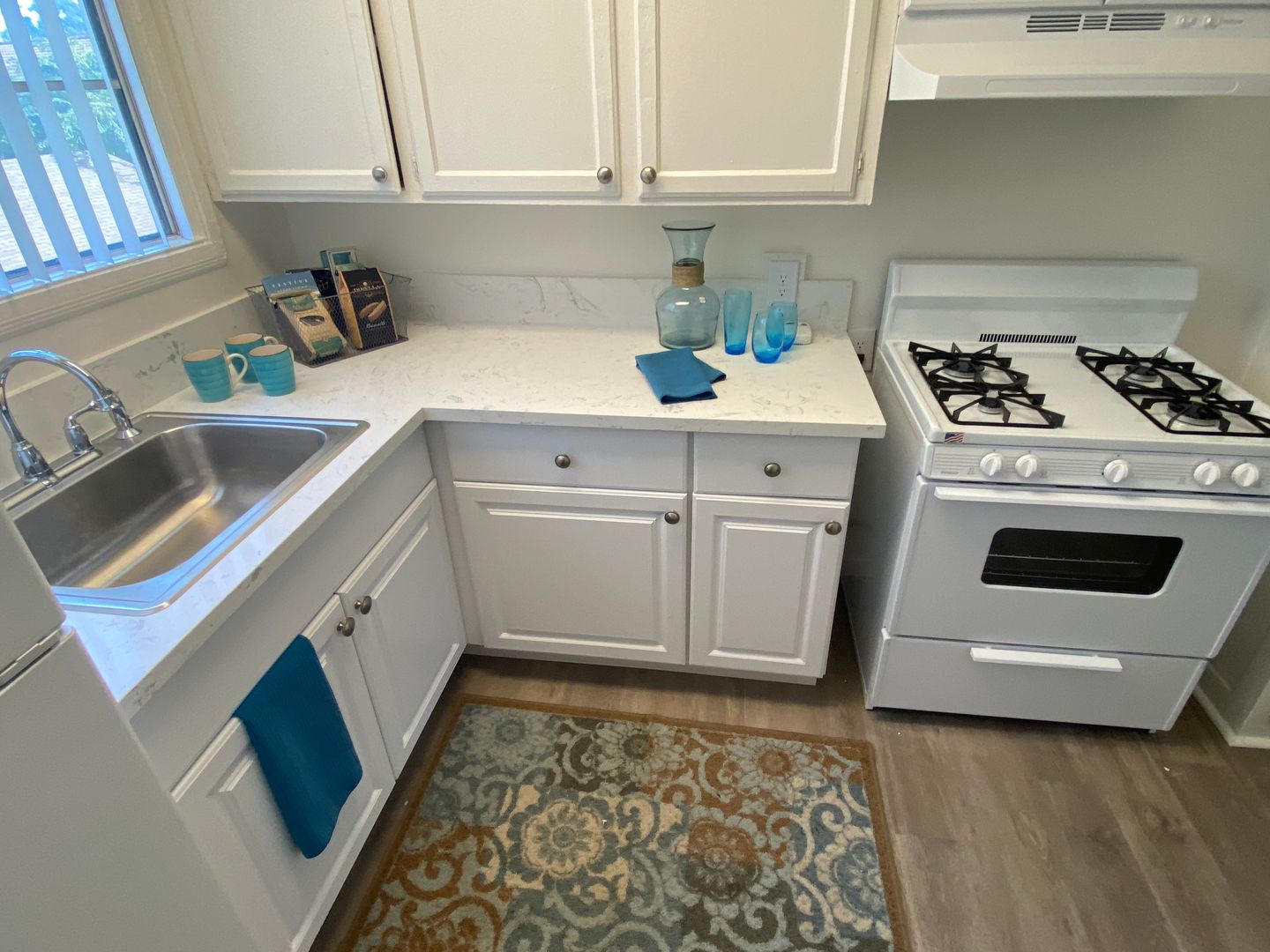 - Quartz countertop kitchen with gas stove + microwave