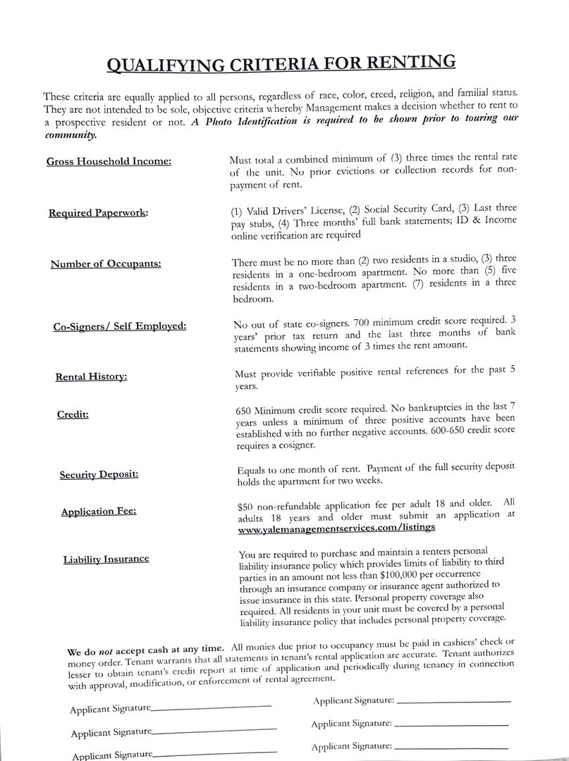Please review the attached qualifying criteria and contact our leasing office to schedule a tour!