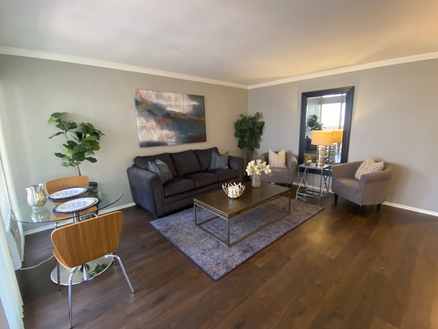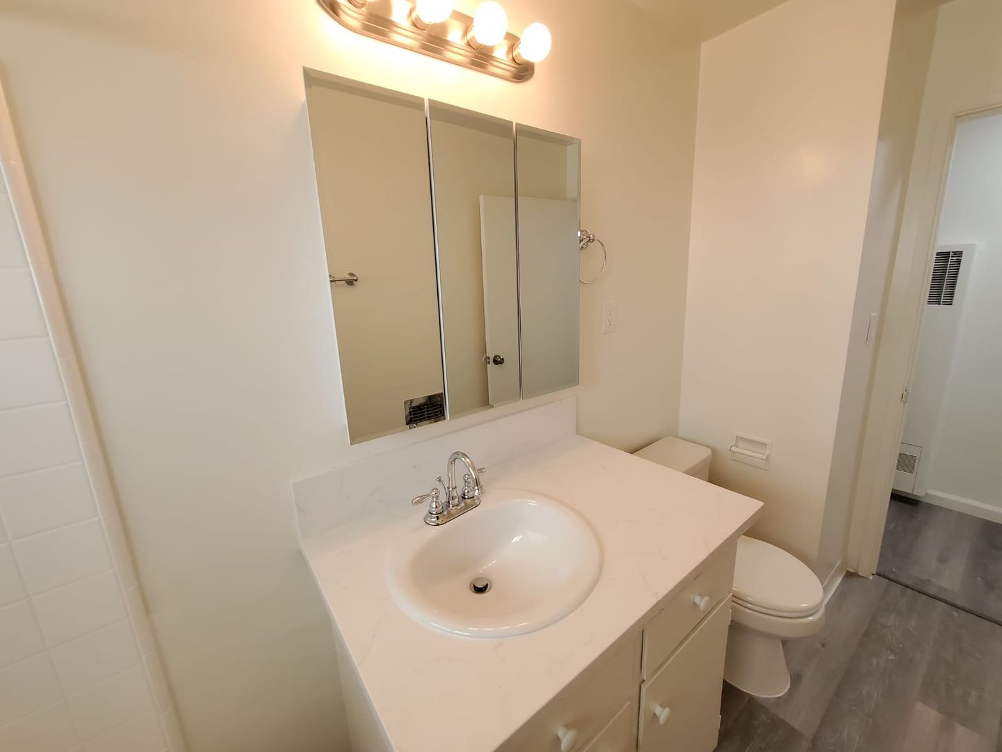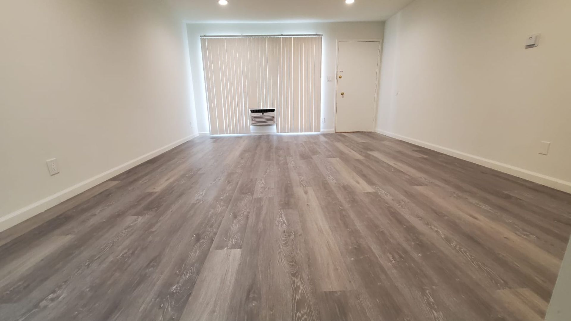 Recessed lighting throughout the apartment creates a bright and inviting atmosphere.