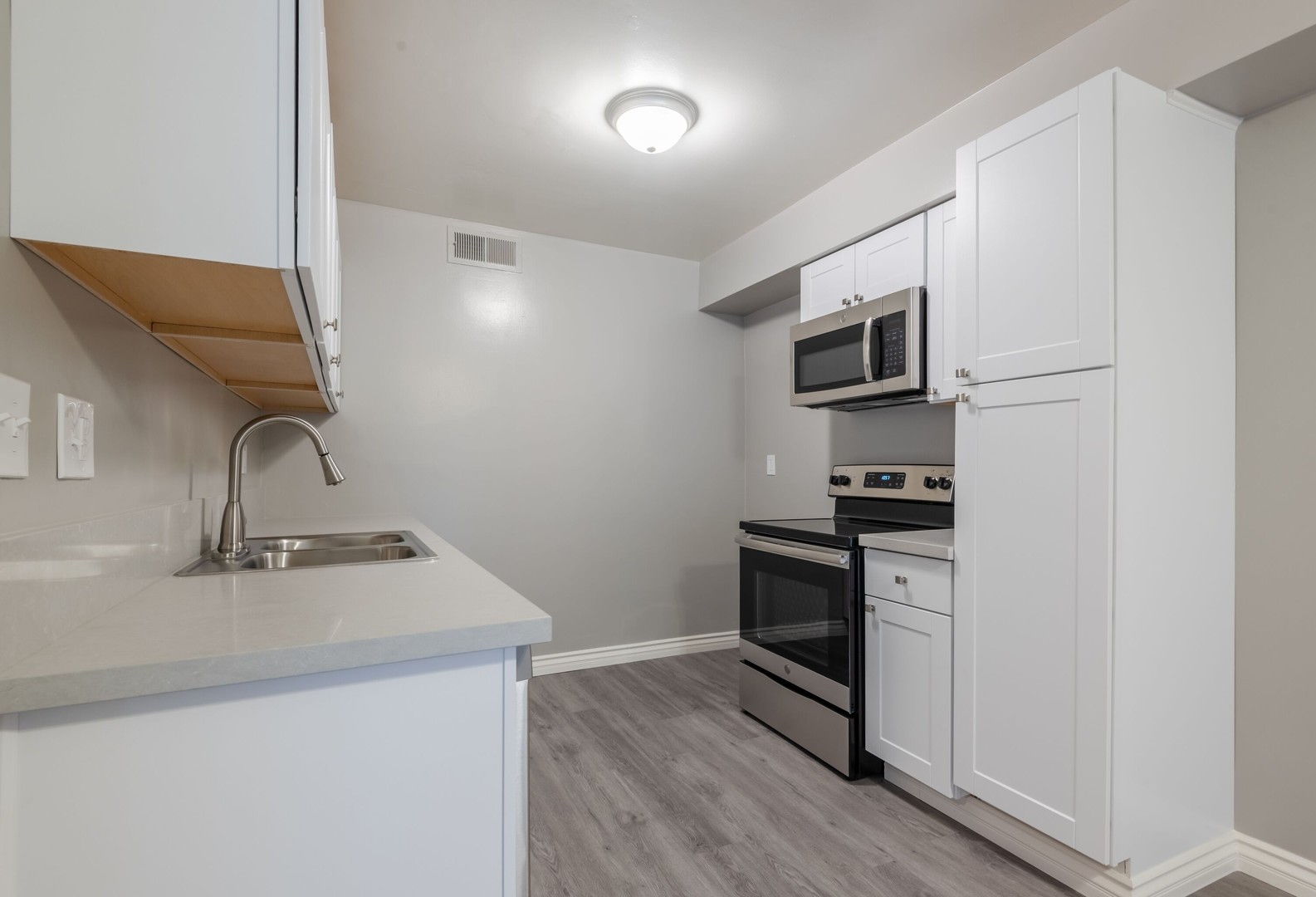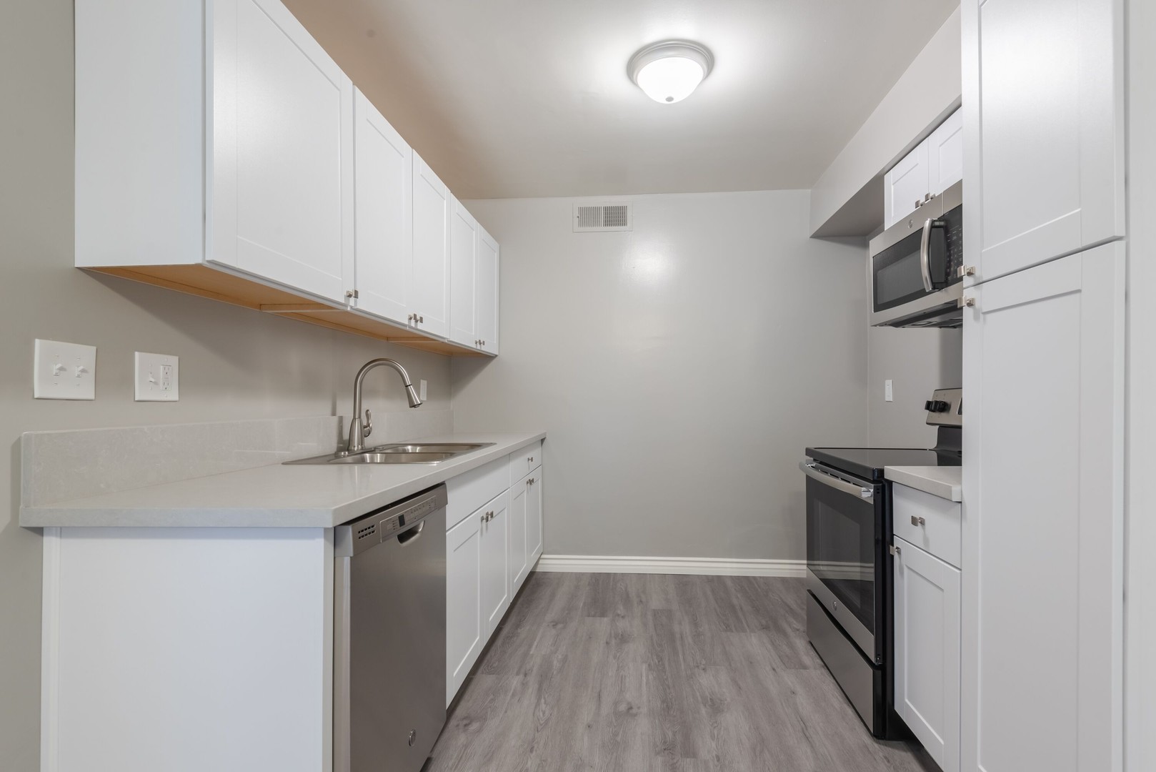 Renovated Kitchen with Stainless Appliances Including Built-In Microwave, Dishwasher, Stove & Fridge