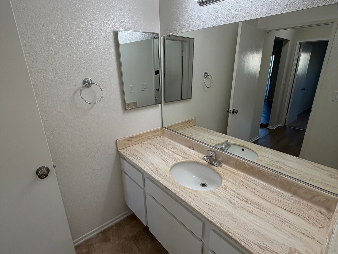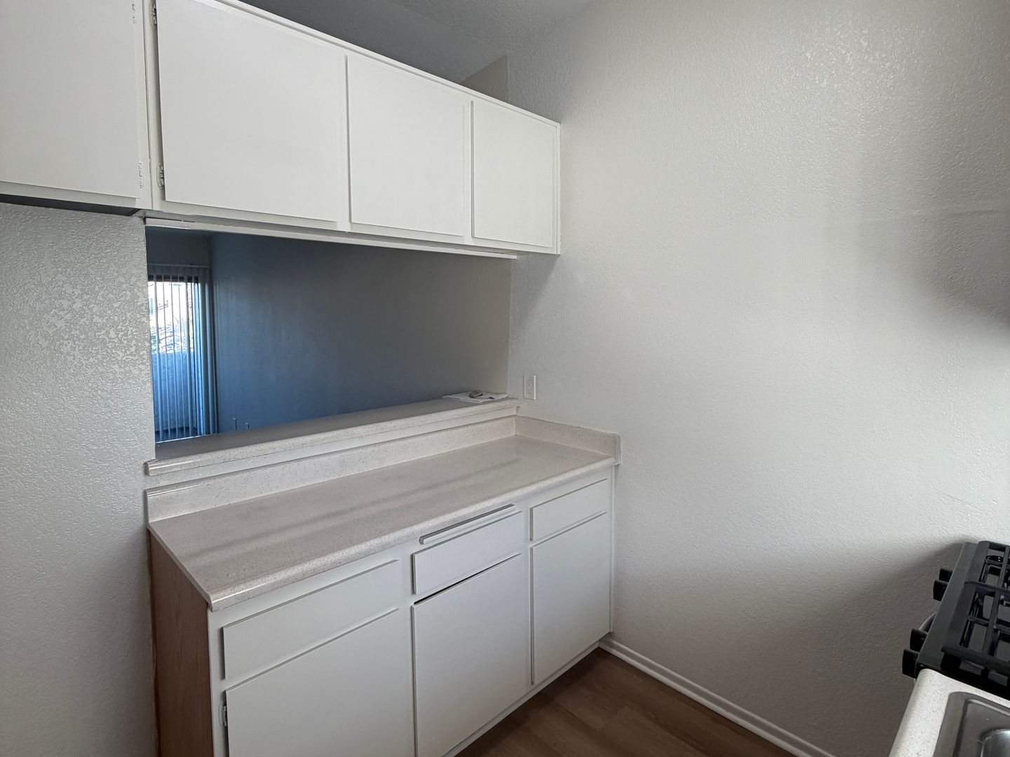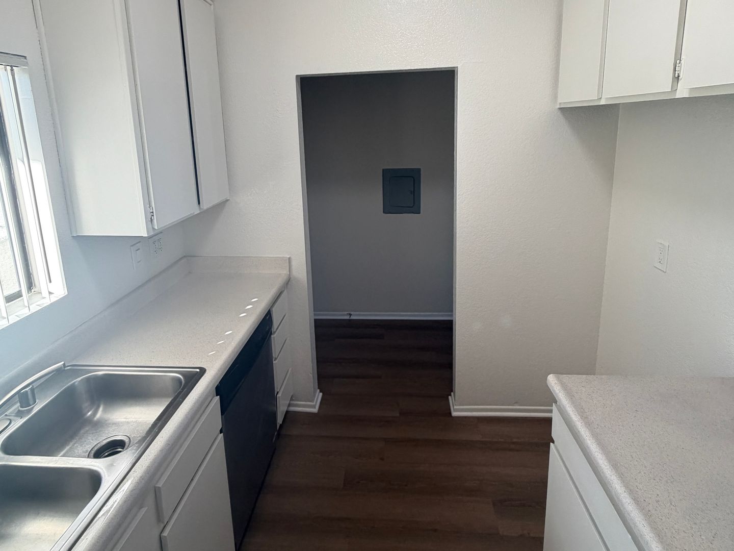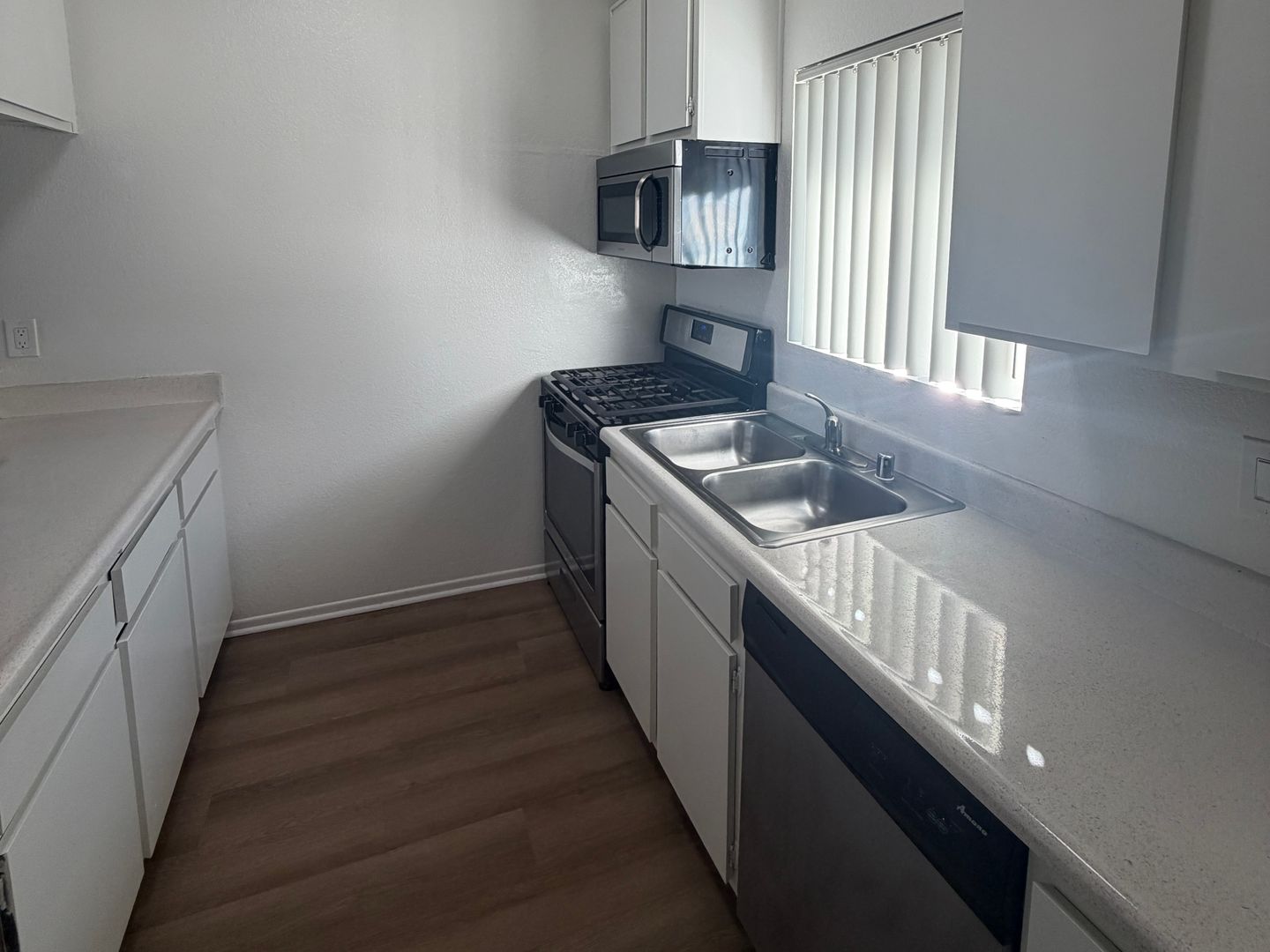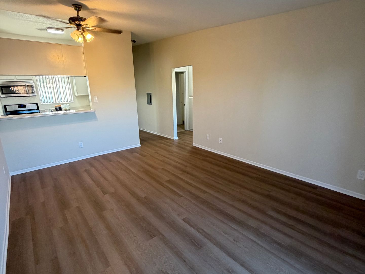 New flooring throughout the kitchen, living room, dining room, and bedroom.