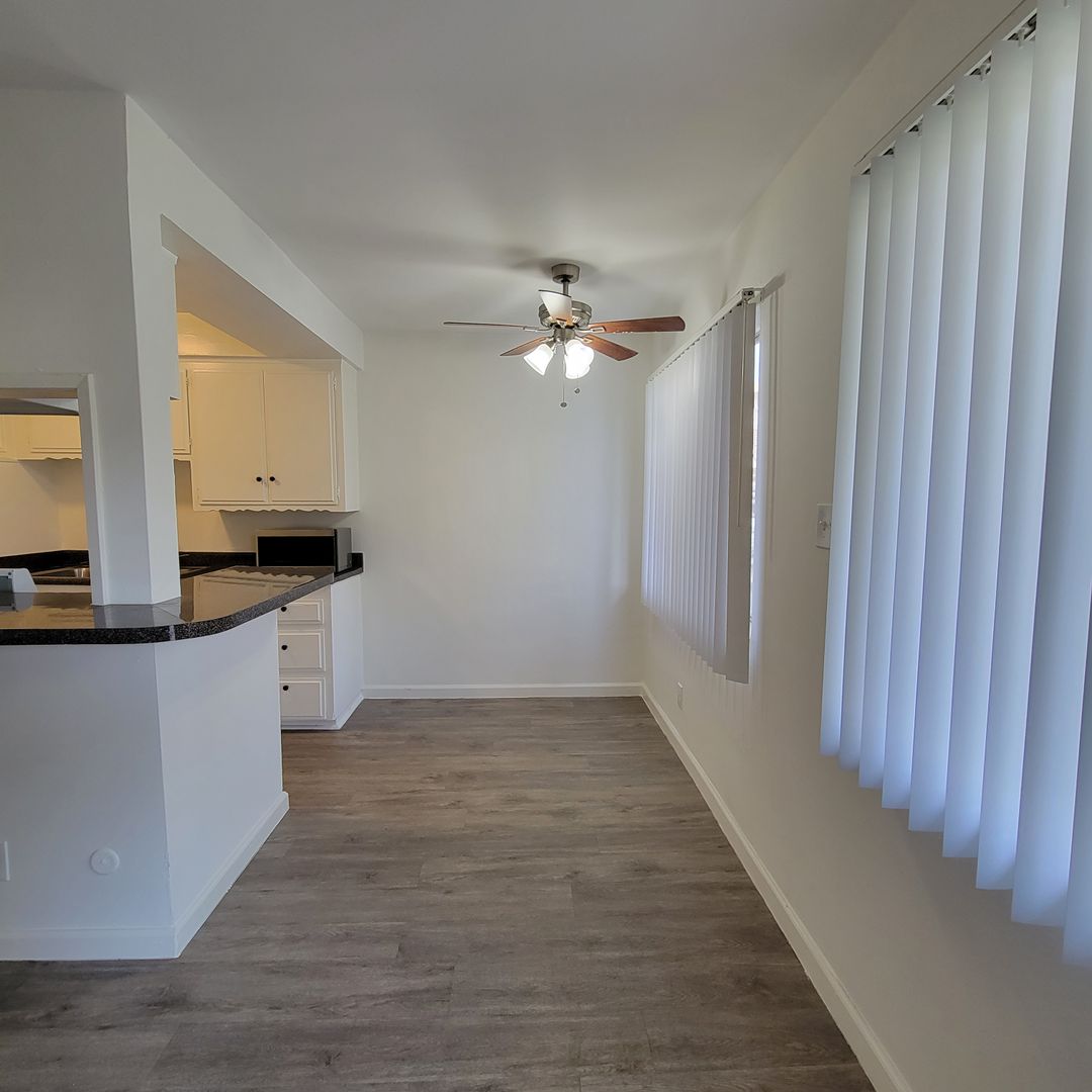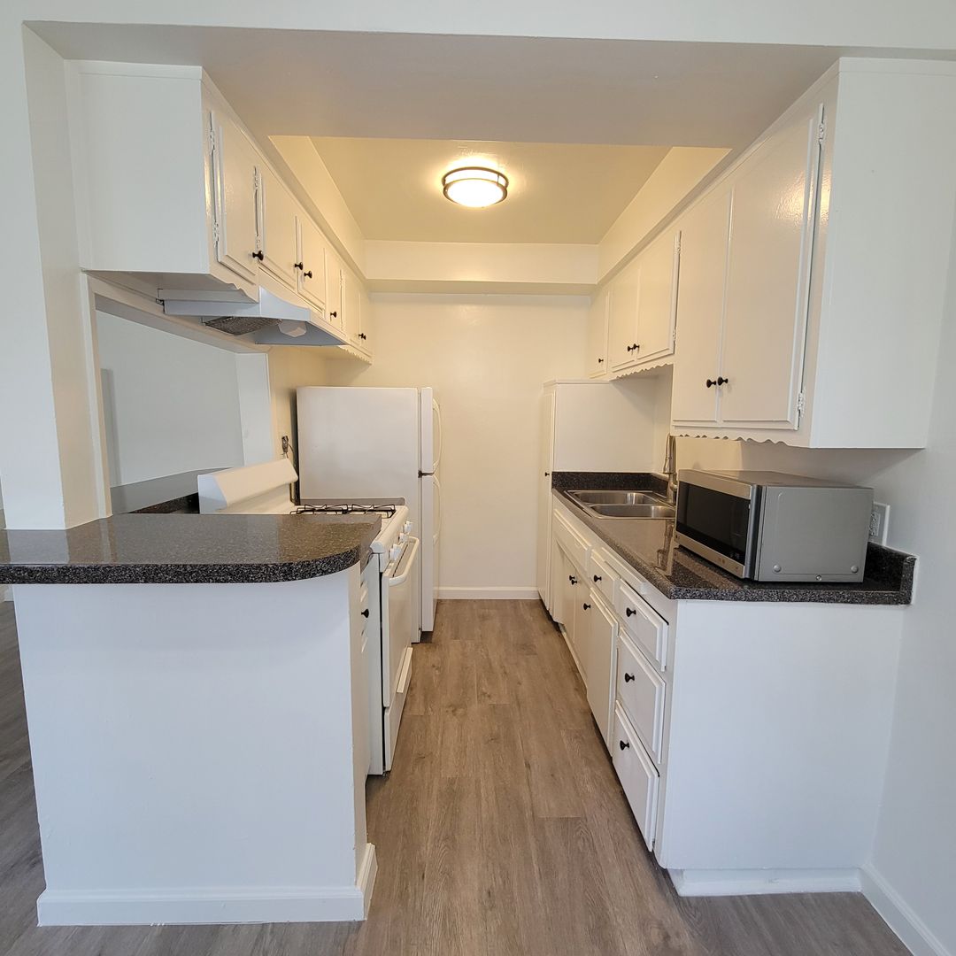 Our accommodations embraces modern wood floors, Cream and White designer paint colors, a modern kitchen with New counter-tops and Ceiling light fixtures with Chrome or Brass accents. This is a 1 bedroom unit on the 1st floor right by the courtyard.